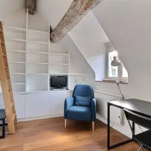 The kitchen is equipped with microwave, cooking plates, kettle and toaster. The mezzanine bedroom offers a comfortable bed for peaceful nights. The bathroom with shower completes this functional ensemble. This pied-à-terre is perfect for taking full advantage of the Parisian art of living in a space that’s both compact and full of character.